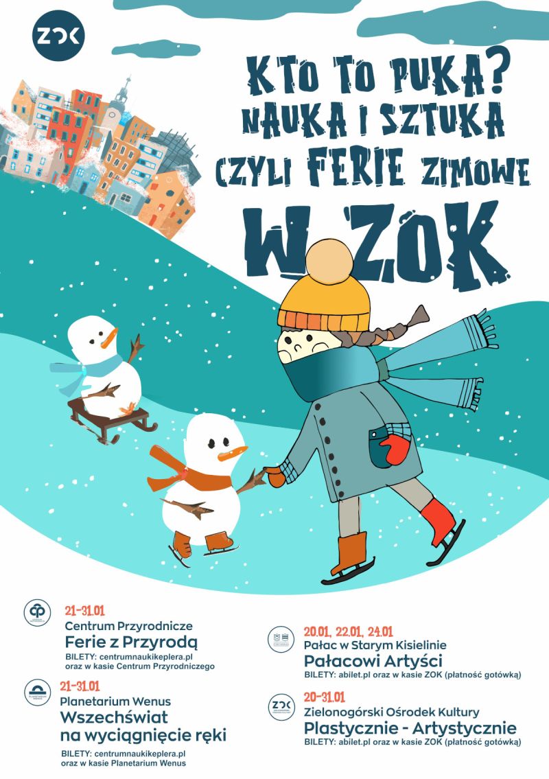 W województwie lubuskim ferie zimowe rozpoczynają się już za moment. W tym roku będą trwać od 20 stycznia do 2 lutego. Zielonogórski Ośrodek Kultury wraz ze wszystkimi swoimi filiami zaprasza na zajęcia tematyczne „Kto to puka? Nauka i sztuka!”, podczas których najmłodsi zielonogórzanie (i nie tylko) mogą wziąć udział zarówno w zajęciach artystycznych jak i edukacyjnych.