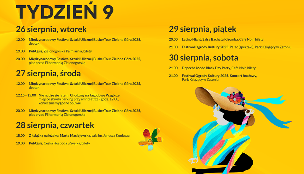 Wakacje zbliżają się do końca. Całe szczęście, że w Zielonej Górze czekają w tym tygodniu wydarzenia kulturalne – osłodzą nam one ostatnie dni Lata Muz Wszelakich. Spotkamy się m.in. na Międzynarodowym Festiwalu Sztuki Ulicznej BukserTour na deptaku, Festiwalu Ogrody Kultury w Parku Książęcym w Zatoniu i wielu innych.